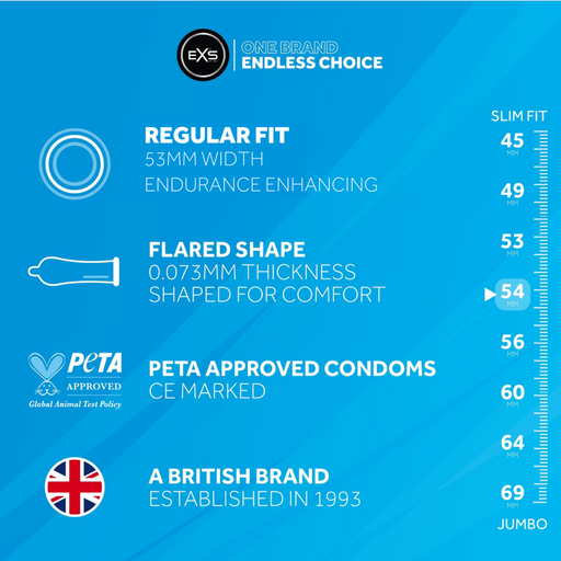 EXSLatex-Kondome OHNE LatexgeruchGleitmittel auf SilikonbasisVegan und PETA-geprüftAlkoholfreiDurchschnittliche Größe 54 mm NennweiteSie suchen ein&nb...