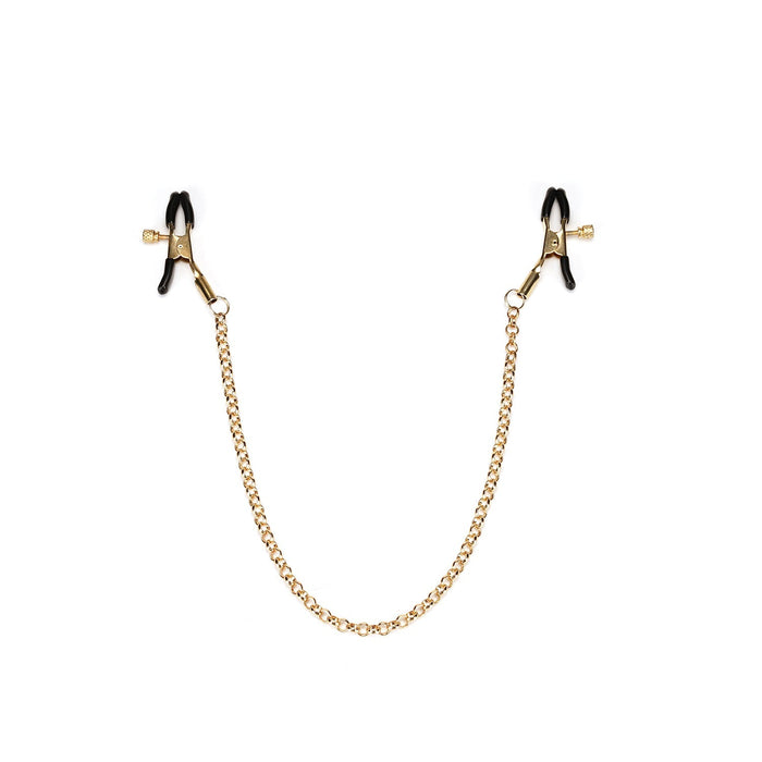 - y un par de pinzas para pezones. Mezcla de materiales suaves y brillantes y metal dorado