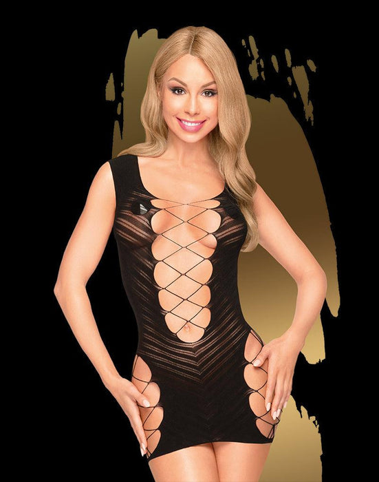 Este sexy minivestido está unido por hilos cruzados en la parte delantera y trasera del vestido, dejando al descubierto el escote y las nalgas.
