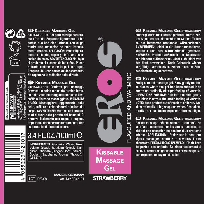 Of je nu alleen bent of samen met een of meer partners , Kissable Massage Gel van EROS is ideaal voor verleidelijk sensuele massage. Blaas zachtjes op de plaatsen waar de fruitig geurende gel is ingewreven, en creëer een erotisch geladen gevoel van warmte. Houdt u van aardbeien? Dan vind je hier precies waar je naar verlangt! Verheug je op een extatische, verleidelijke en ongelooflijk stimulerende massage-ervaring.