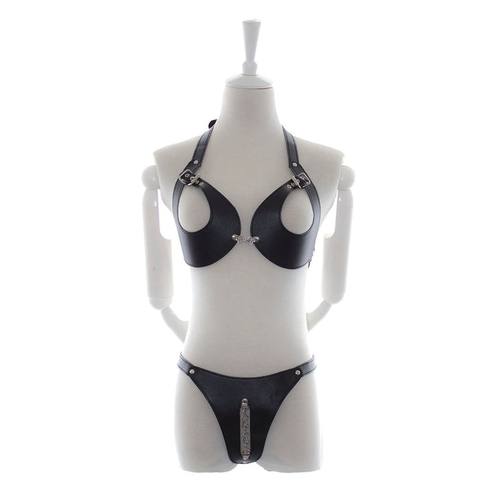 Fixxx - Fetish BH en Slipje met Open Kruis - Nr. 2 - PU-Leer - One Size - Zwart