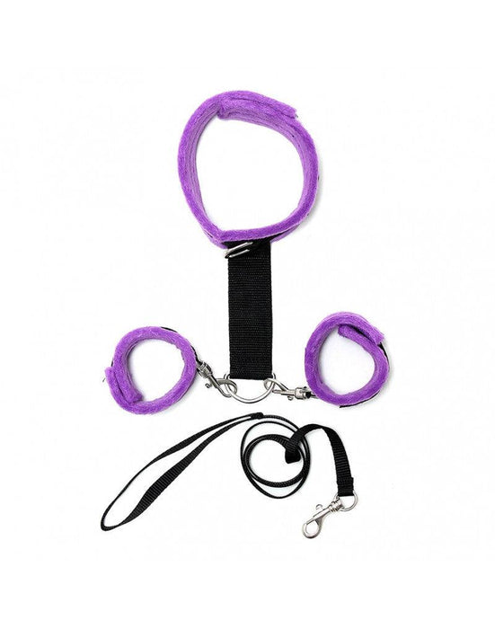 Rimba - Soft Bondage Collar Met handboeien En leiband - Zwart/Paars